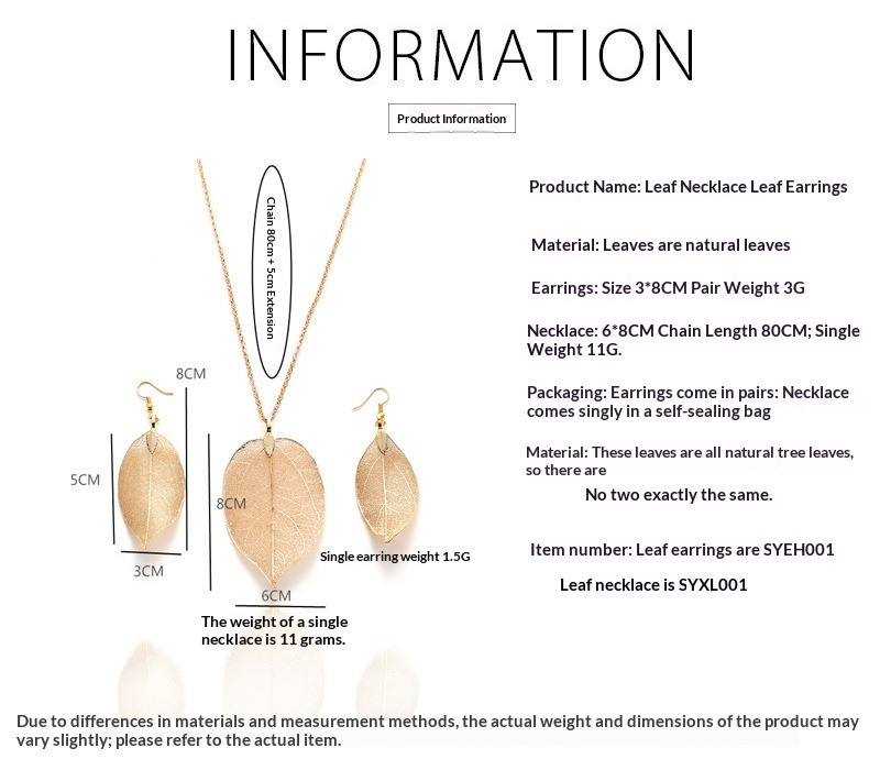Premium Alloy Construction - Durable and lightweight for all-day wear Electroplated Finish - Long-lasting shine and protection Natural Leaf Design - Botanical pattern inspired by real plants and flowers Box Chain Style - Classic and elegant necklace chain European and American Style - Sophisticated and versatile design Complete Set - Perfectly matched necklace and earrings