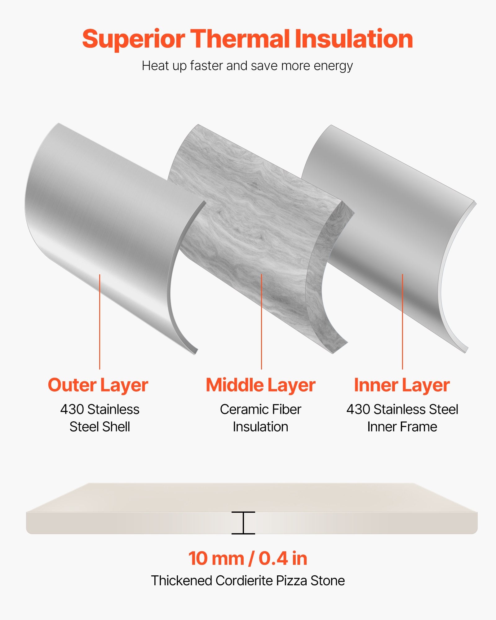 Professional 3-Layer Construction Engineered for maximum heat retention and efficiency with a sophisticated triple-layer design. The 430 stainless steel outer shell provides durability and weather resistance, while thick insulation cotton in the middle layer traps heat for consistent cooking temperatures and fuel efficiency. The inner layer promotes optimal heat circulation for even cooking across the entire pizza stone.